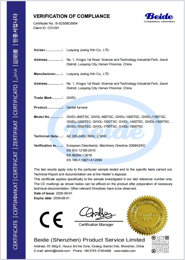 Our company has obtained CE certification for dental furnace equipment through an authorized third-party laboratory. The certification confirms compliance with EU Machinery Directive 2006/42/EC and relevant EN standards, ensuring product safety, precise temperature control, and reliability for dental laboratory applications in the European market