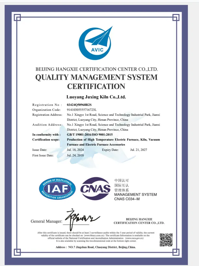 Luoyang Juxing Kiln Co., Ltd. completed ISO 9001:2025 preliminary review and recertification, confirming its quality management system meets international standards and ensures product reliability.