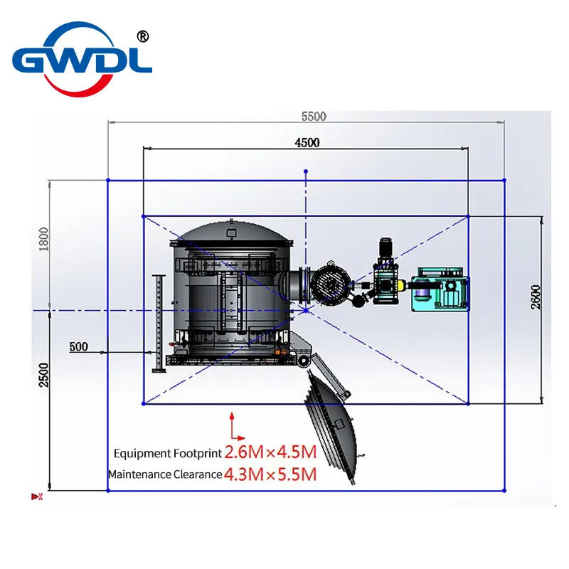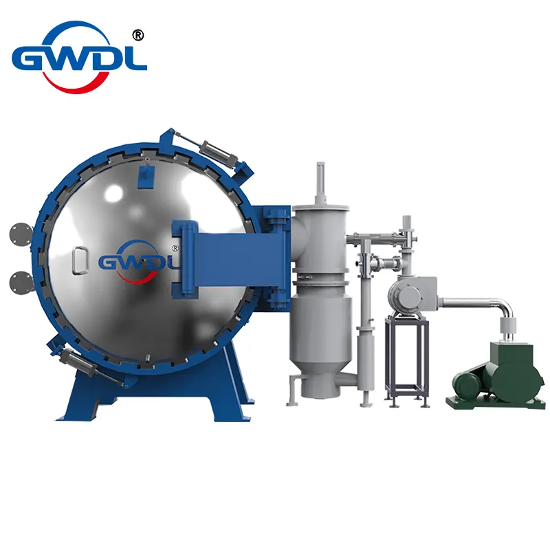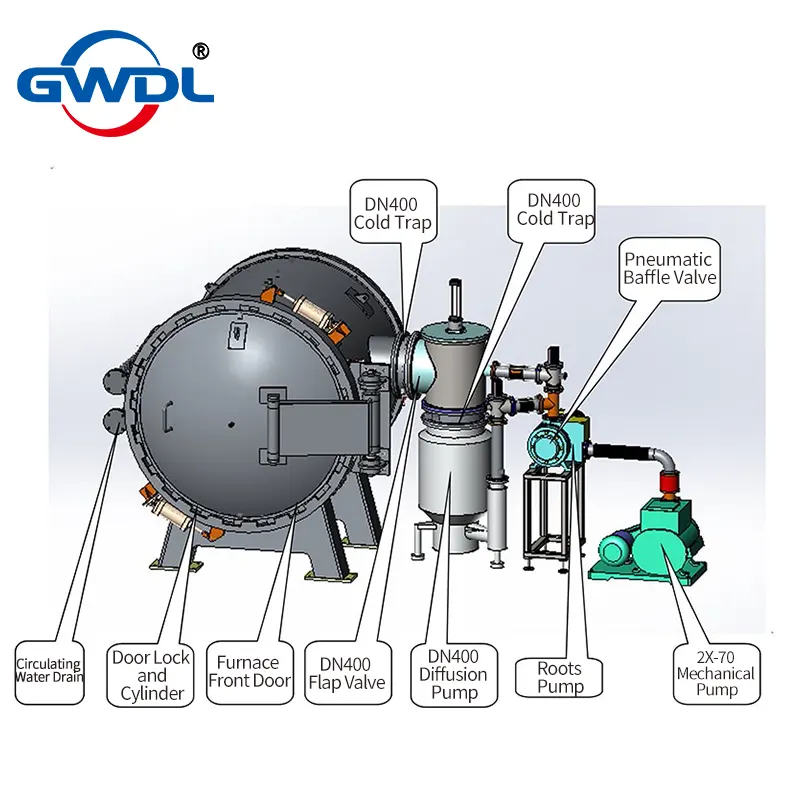 The GWL High-Temperature Vertical Vacuum Electric Furnace consists of a horizontal main unit (single-chamber), a vacuum system, a gas-filling system, a water-cooling system, a pneumatic system, an electrical control system, and other components.
